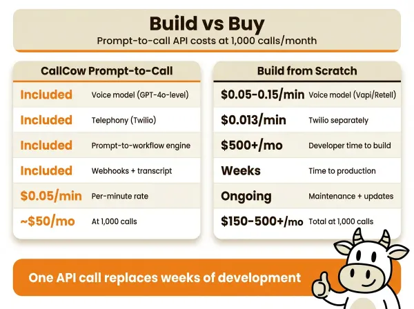 CallCow came out of the same problem: I got tired of the status quo in voice AI. Every platform makes you configure conversation flows, set up phone infrastructure, and write boilerplate before your first call goes out. That's backwards if you just need an AI agent to make a phone call.