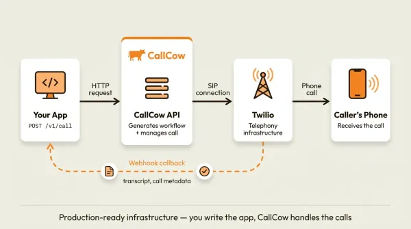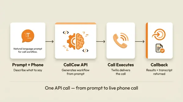 CallCow's Agent Calling API takes a different approach. You send a natural language prompt and a phone number to a single endpoint. The API generates the workflow, places the call, and returns the results. One request. No pre-configuration. No conversation state management. No telephony setup beyond connecting a phone number.