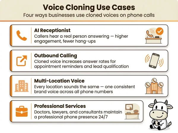 - Real estate agents, professional services, and home services businesses where caller trust matters and a familiar voice can make the interaction feel more personal and credible
