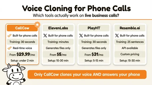 That is a real engineering project. CallCow bundles the voice cloning with the phone system. The cloned voice is not an audio file you download. It is the voice the AI uses when it talks to your callers. That integration is what makes it useful for businesses that just want their phone answered.